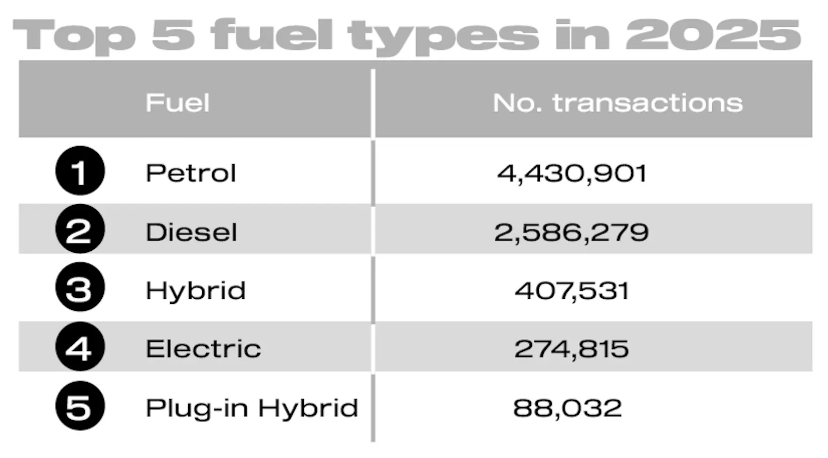 Electrified cars combined now represent a 30.9% increase in transaction over 2024. We can see the trends moving from diesel into electrified cars, but there is some way to go for these trends to catch up with new cars registrations. More on that here https://theinterface.uk/blog-posts/a-look-back-at-the-vehicle-registrations-for-2025.