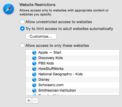 You can choose to block certain websites from kids. OS X can automatically try and limit access to adult sites, here Apple will attempt to filter inappropriate stuff from users, but you can also customise which websites are seen.